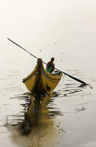 A serene watercolor capturing a lone figure rowing a yellow boat across calm waters. With soft reflections and minimal detail, the painting evokes solitude and peace during the quiet hours of evening. Mukesh Singh Bisht’s loose brushwork and earthy tones create a poetic and tranquil scene.