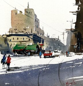 A captivating watercolor by Mukesh Singh Bisht, portraying an old cityscape with historic architecture, bustling streets, and vibrant market shades. The interplay of soft washes and sharp details evokes both the charm of heritage and the rhythm of everyday urban life.